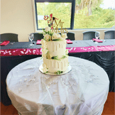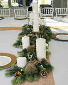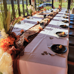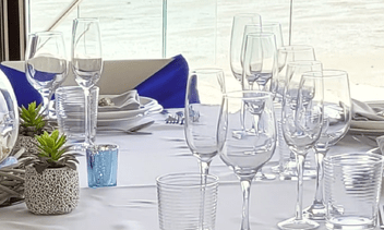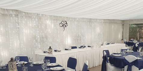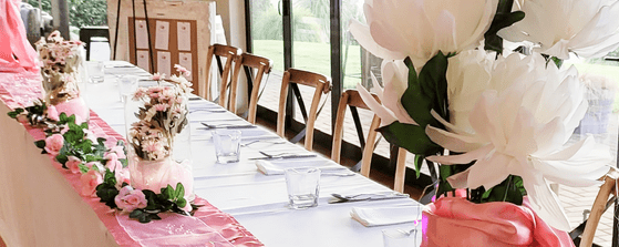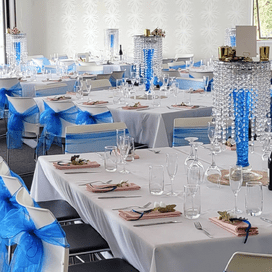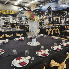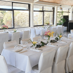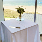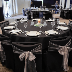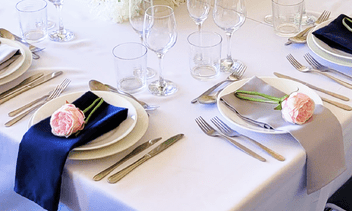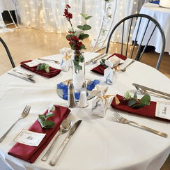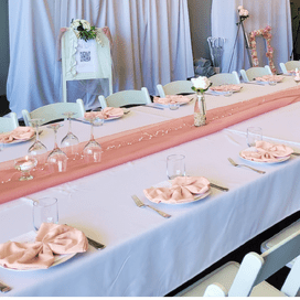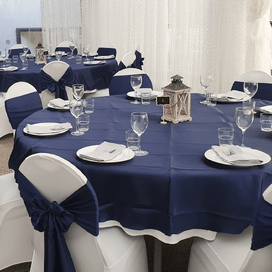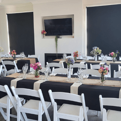 We have a nice variety of colours and fabrics to choose from for your table runners and napkins. Napkins are pre-pressed to your chosen fold design. High quality pre-pressed tablecloths are available in black and white to suit large or small, round, square and long tables. We can also do table skirting with pleats, swag or a simple boxed cloth.