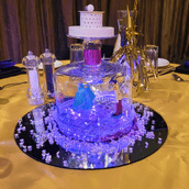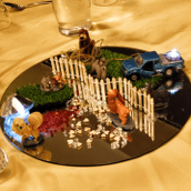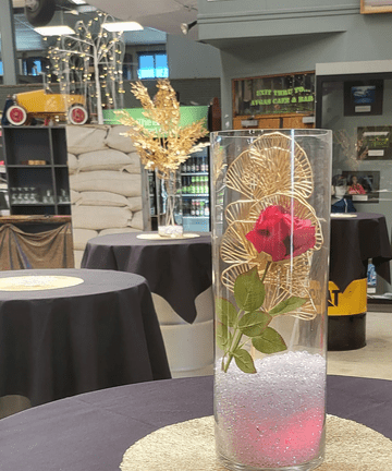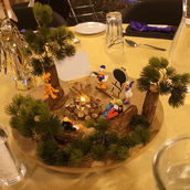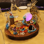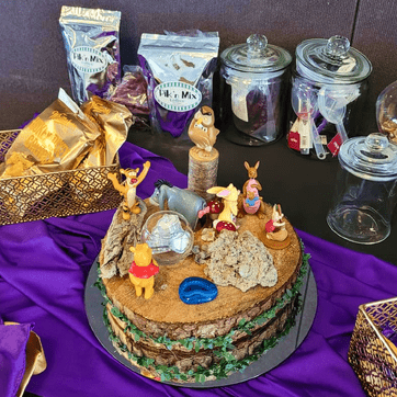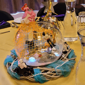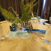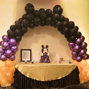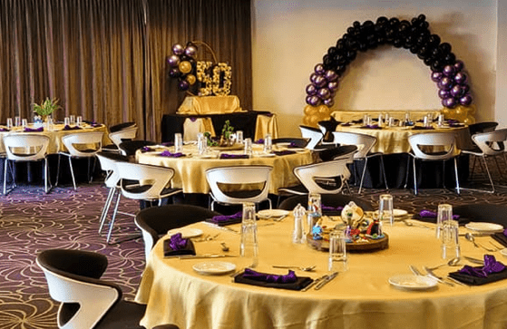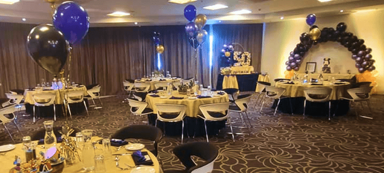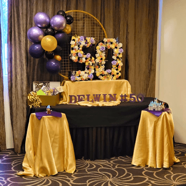 Delwyn had a themed 50th surprise birthday which had been cancelled 3 times due to Covid. The brief was to use gold and Cadbury purple, each table will represent Disney movie and the birthday girl loves Mickey Mouse – no Minnie – just Mickey! The Disney figurines were provided, which we turned into table centres depicting each Disney movie. We used gold satin table cloths, purple satin napkins, and made the balloon garland shaped like Mickey Mouse ears. The fifty was made from silk flowers crafted by my own fair hand!